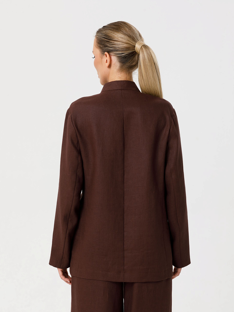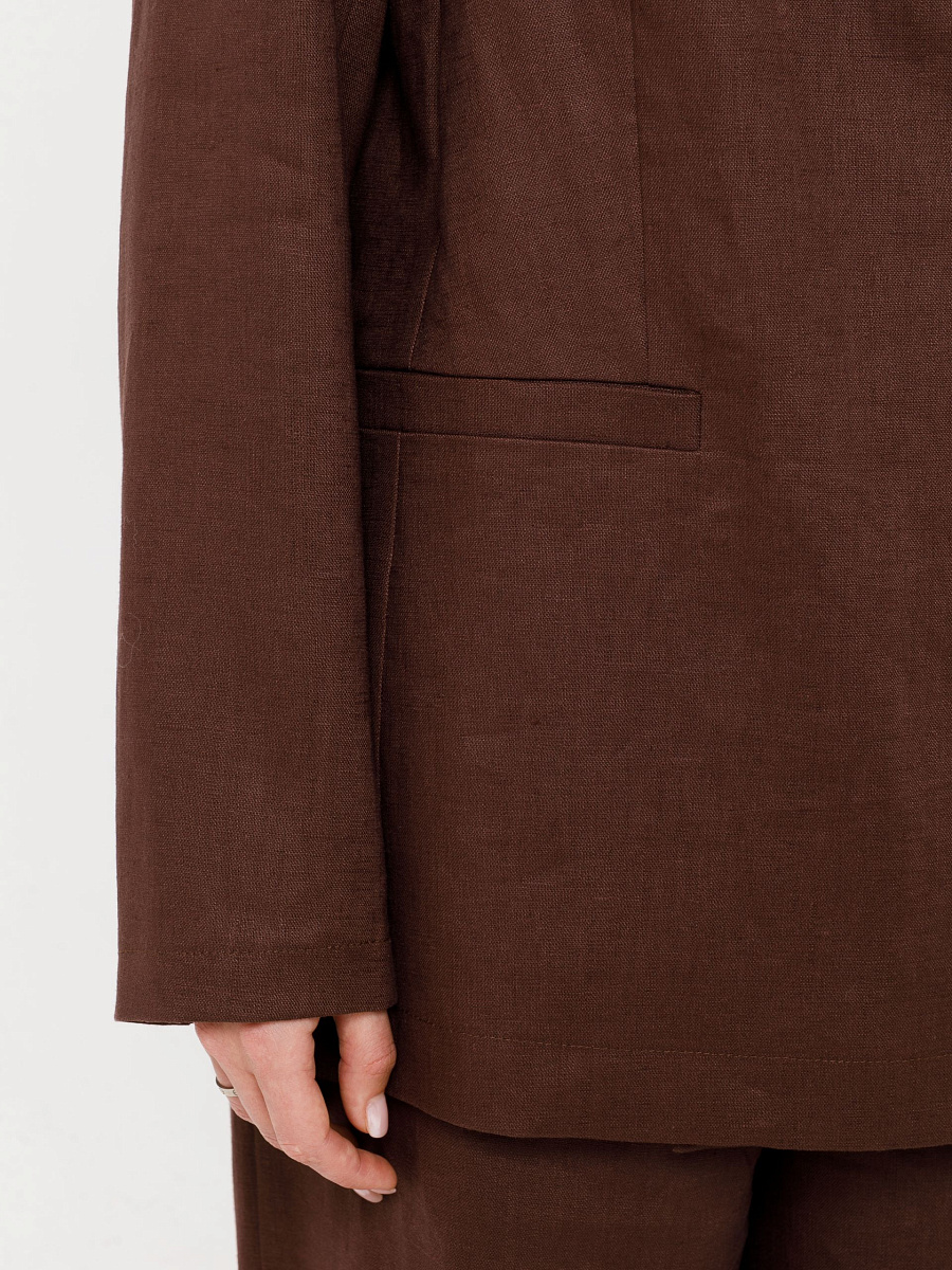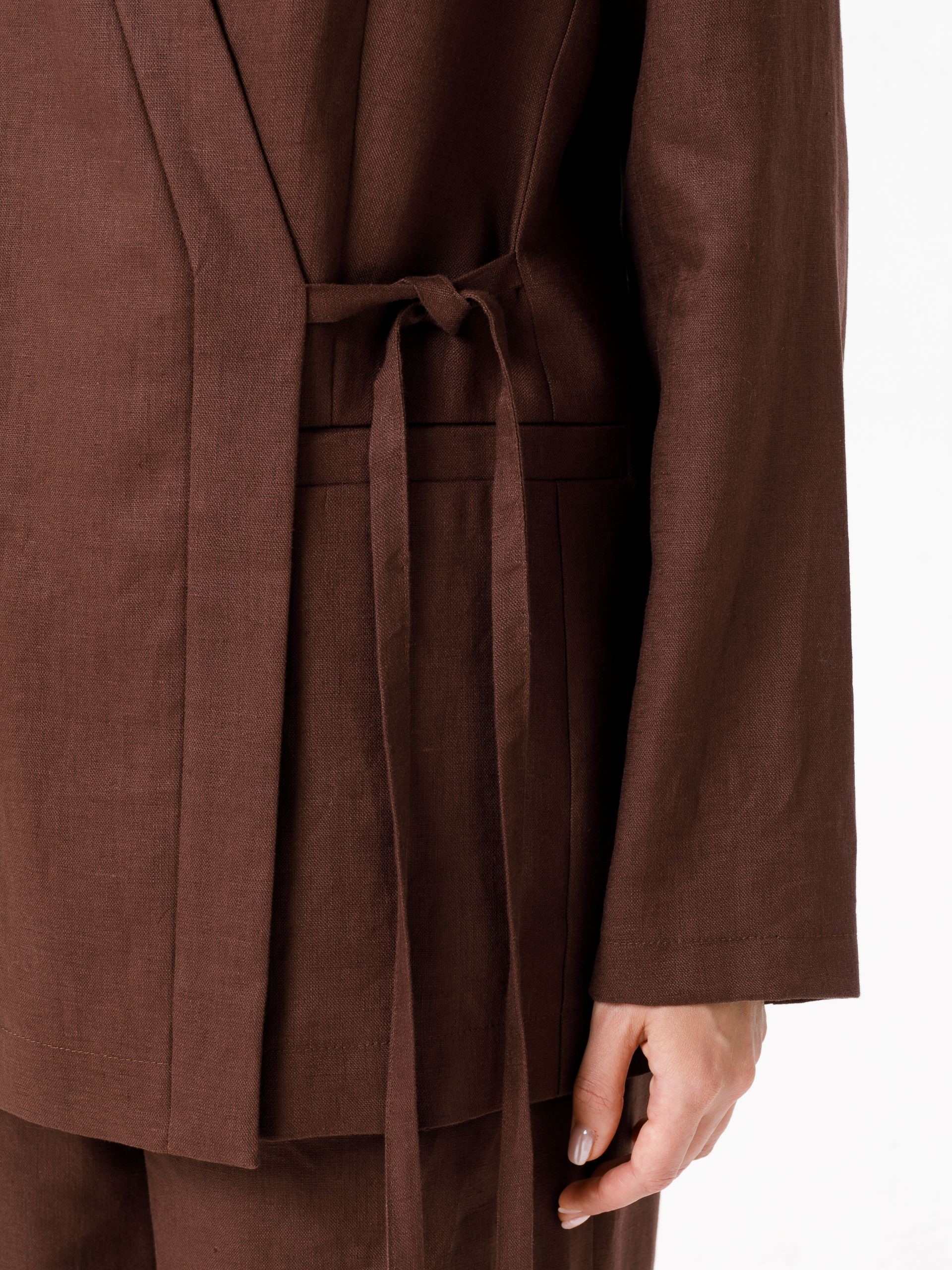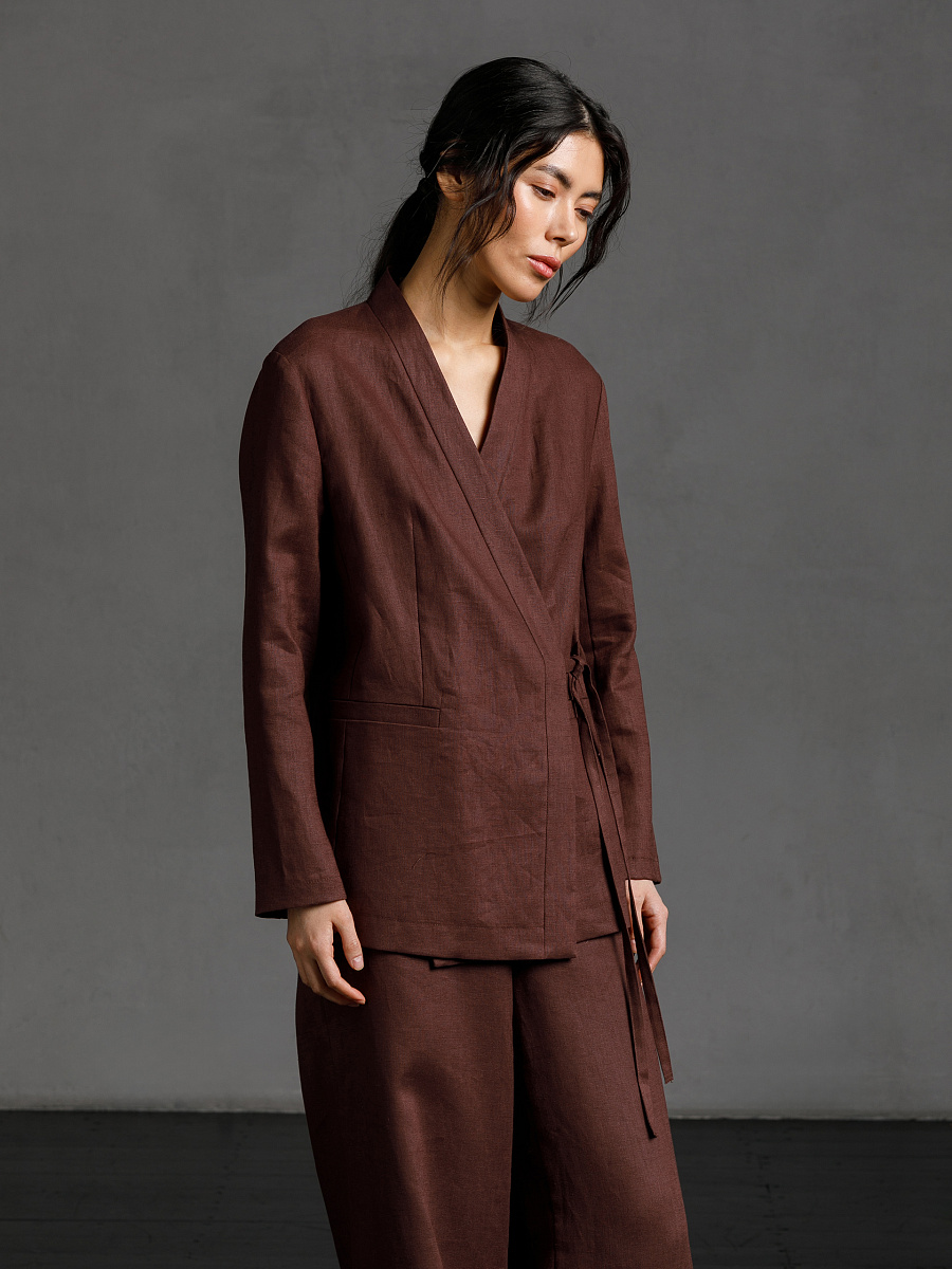 Модель прямого силуэта, со спущенным плечом, с рельефами, без боковых швов, с запахом и завязками, без подклада. Спинка со средним швом. Спереди прорезные карманы с листочкой. Вороткик стойка переходит в планку переда.