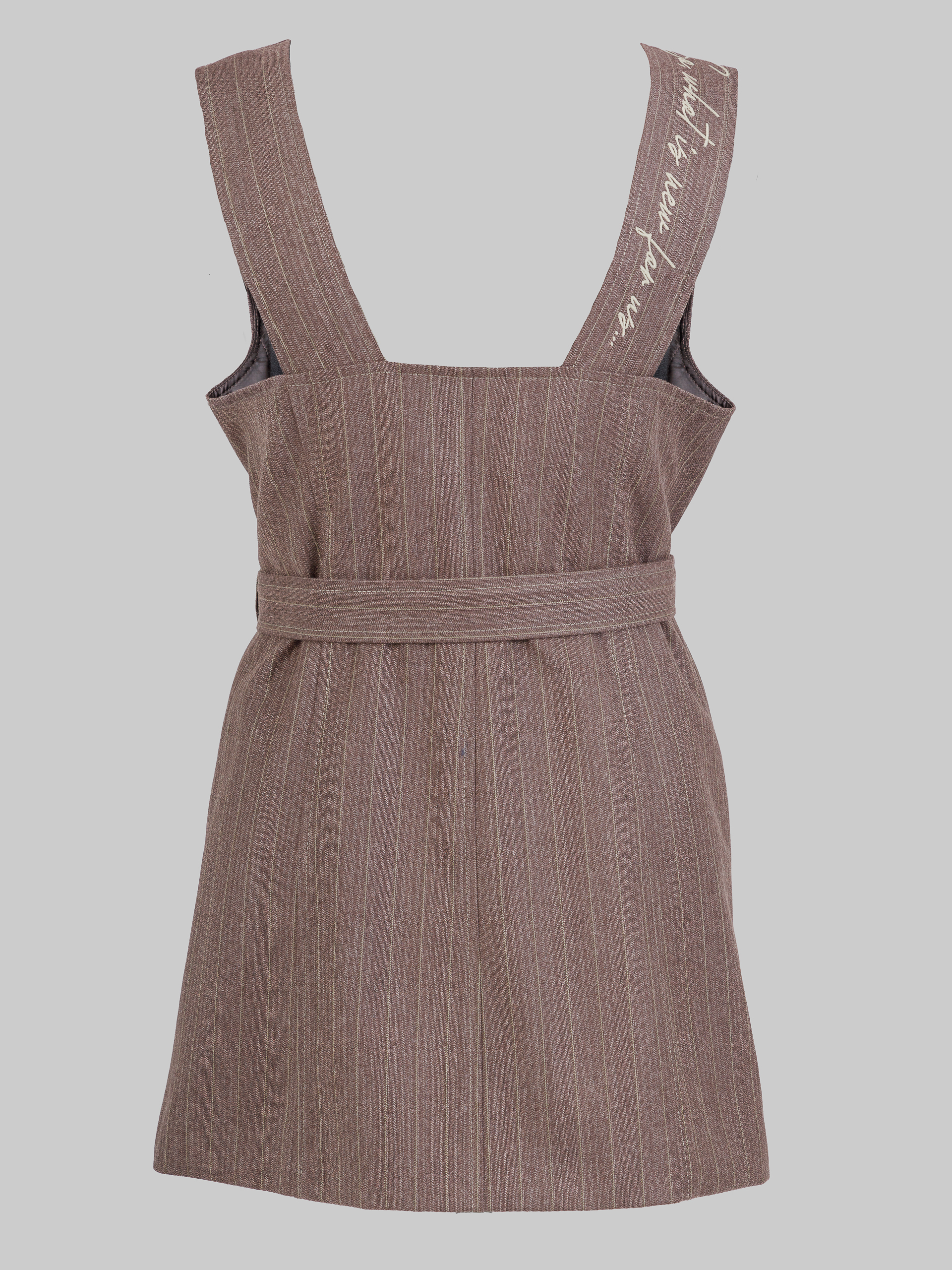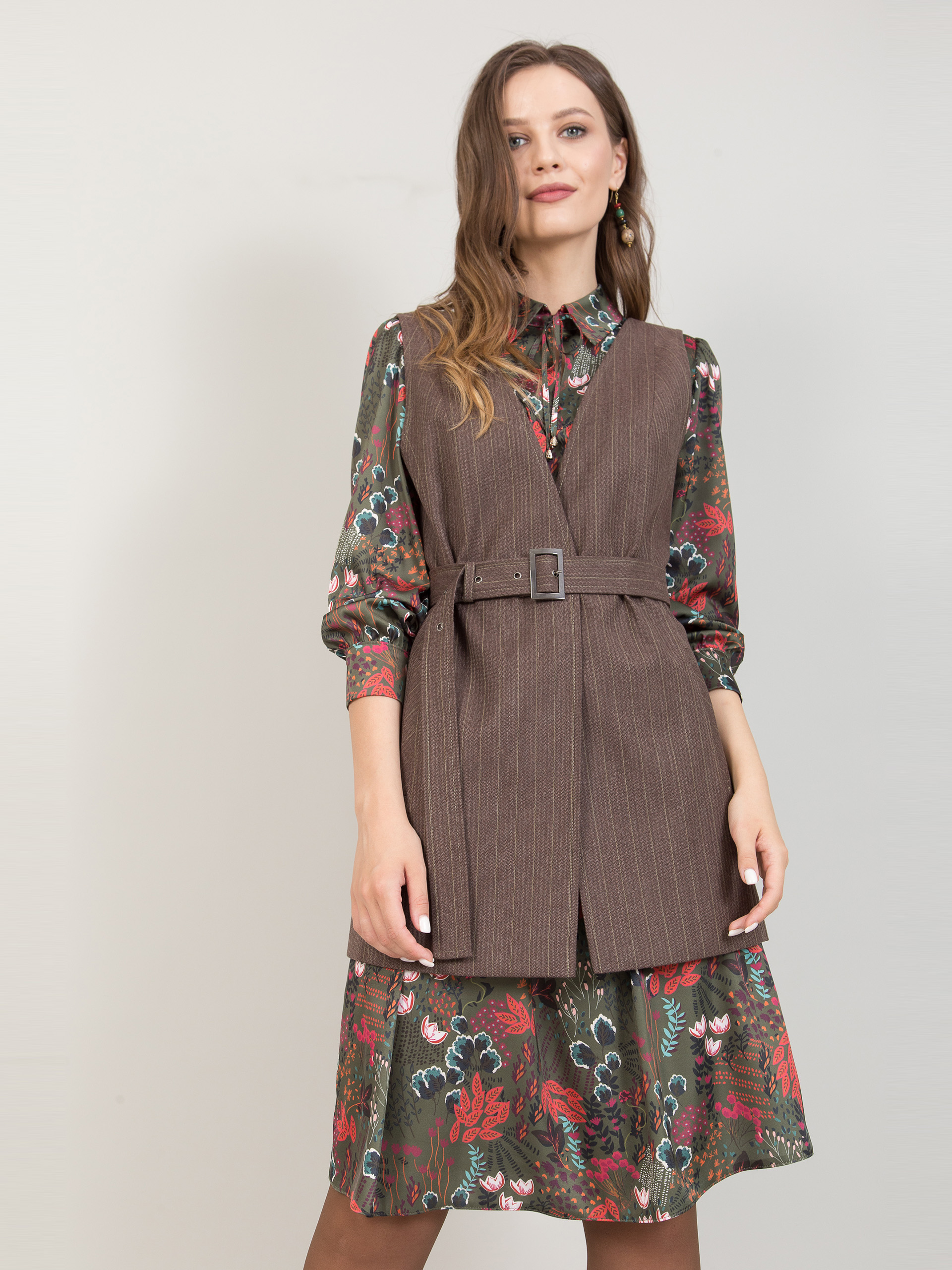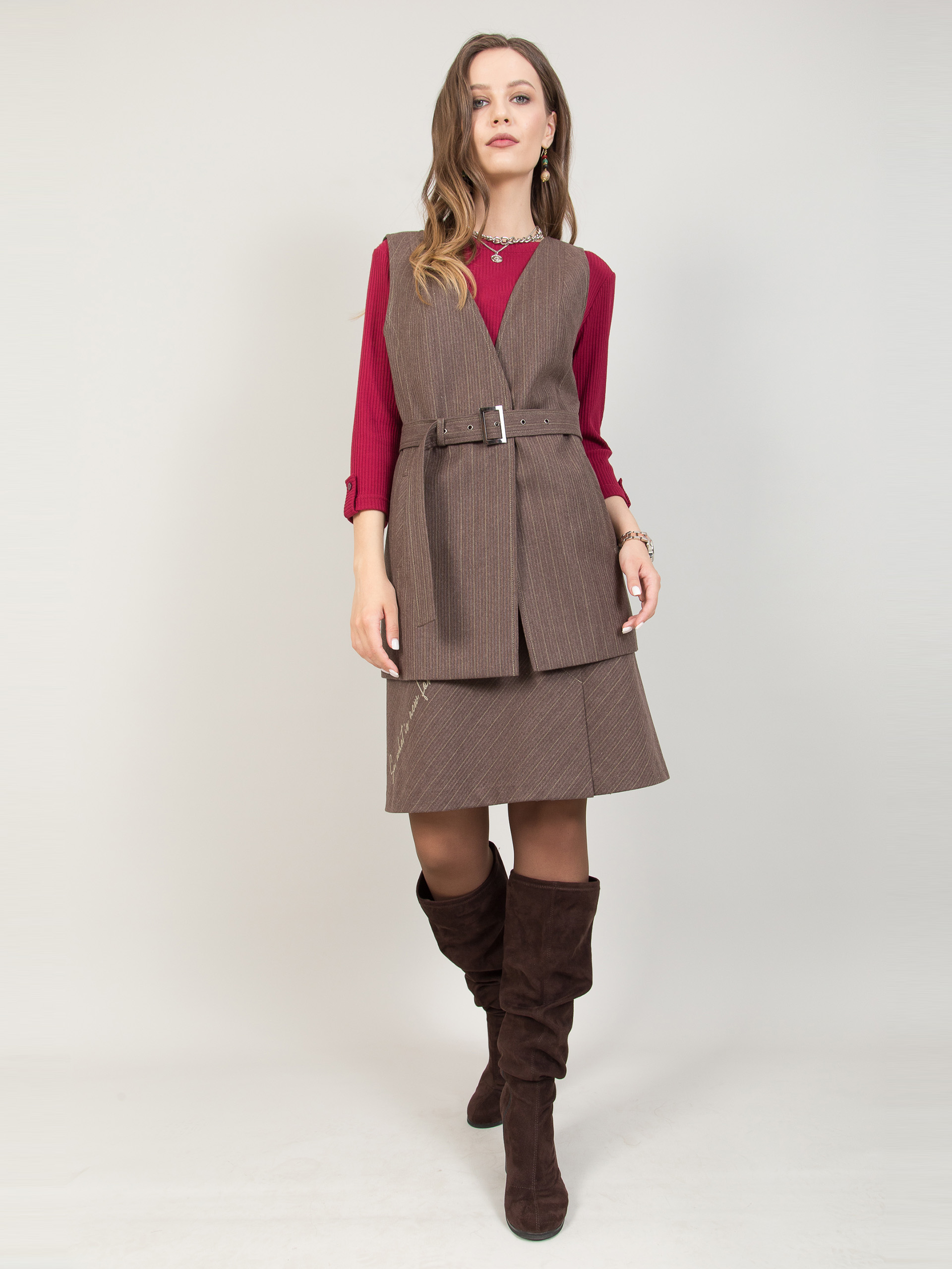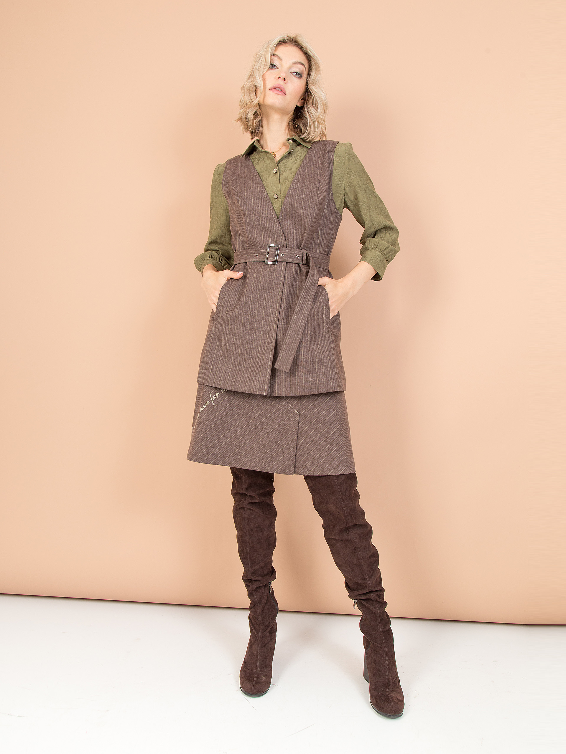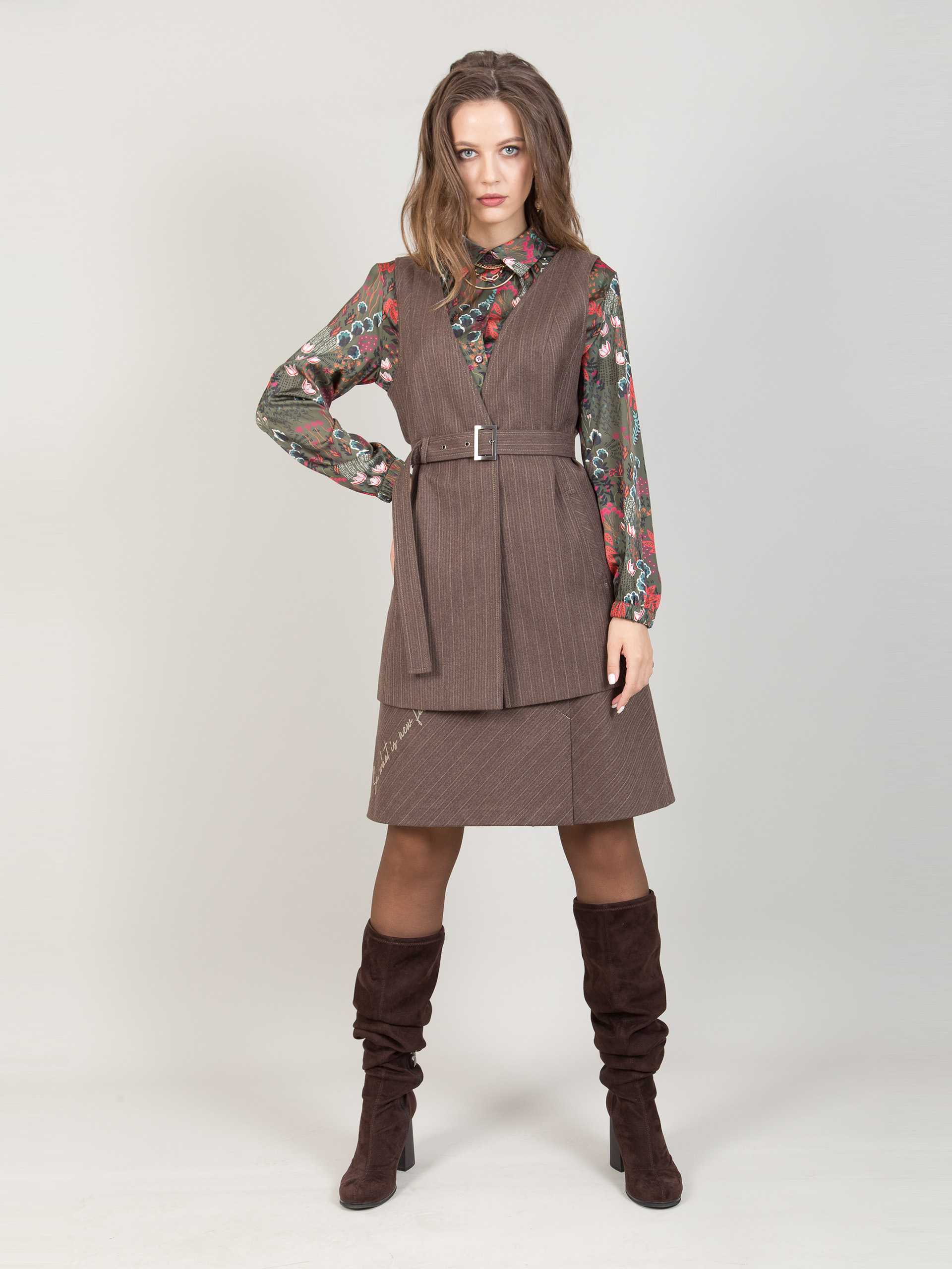 Модель с рельефными швами .Пояс с металлической пряжкой. Жилет декорирован отделочными строчками и текстовой вышивкой на лямке.