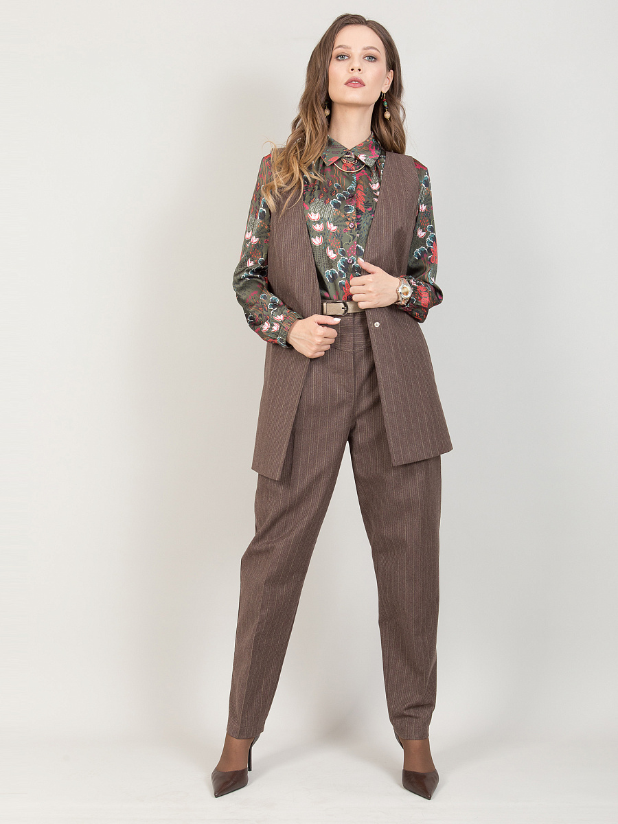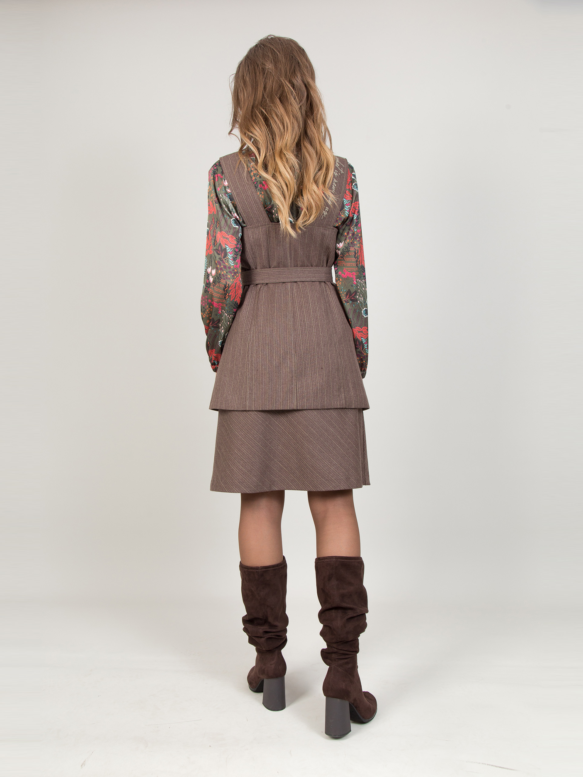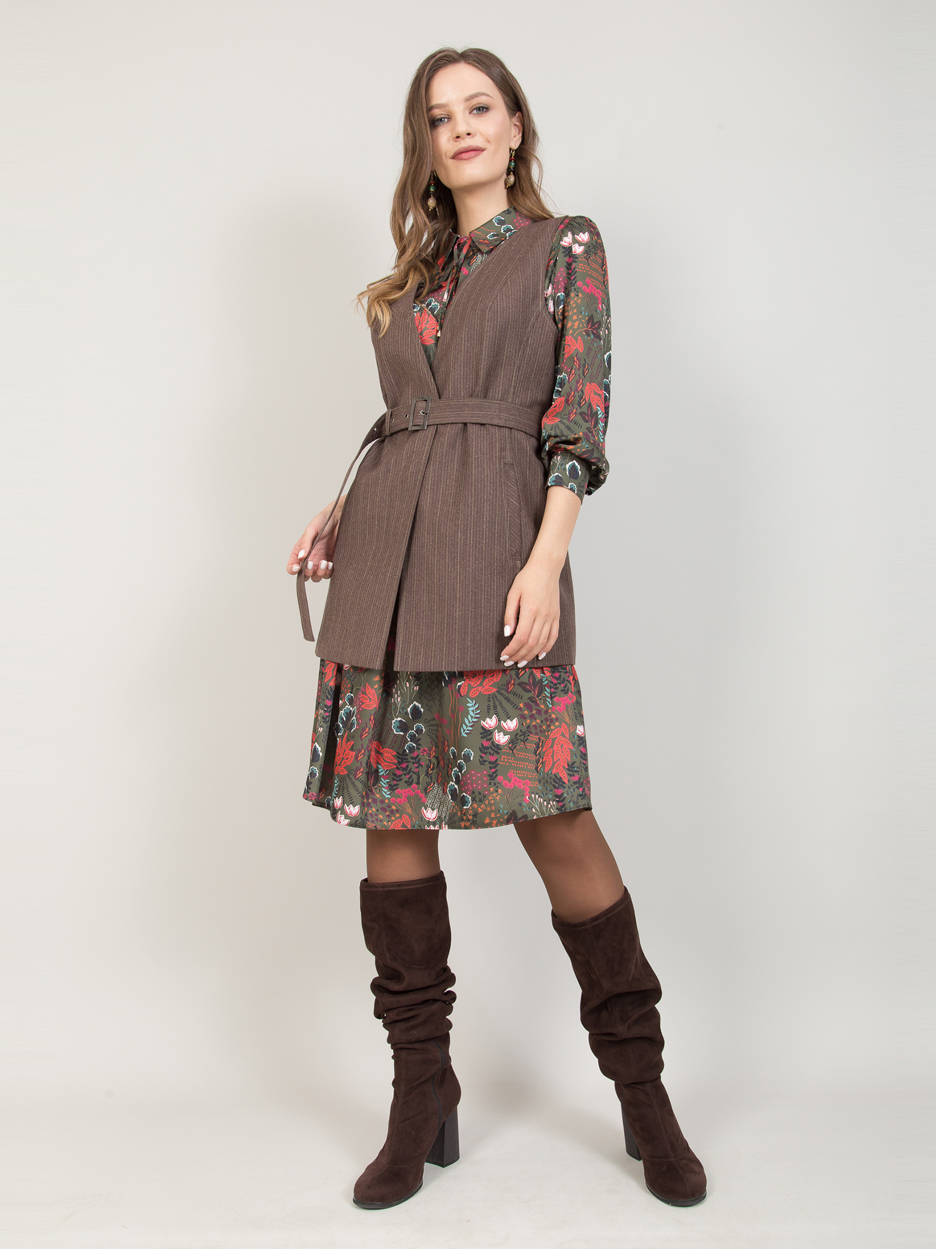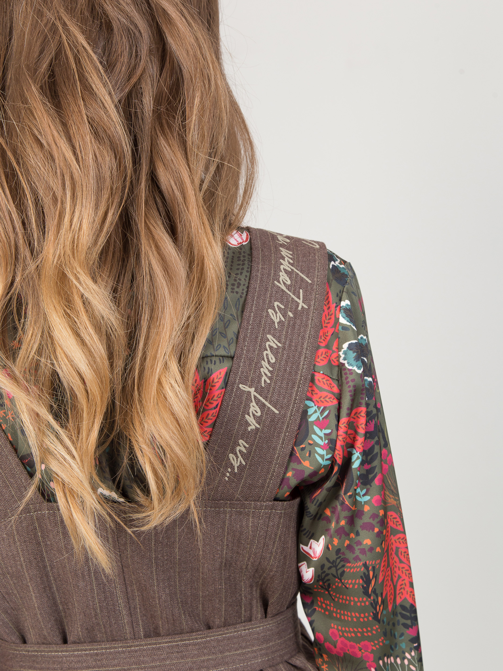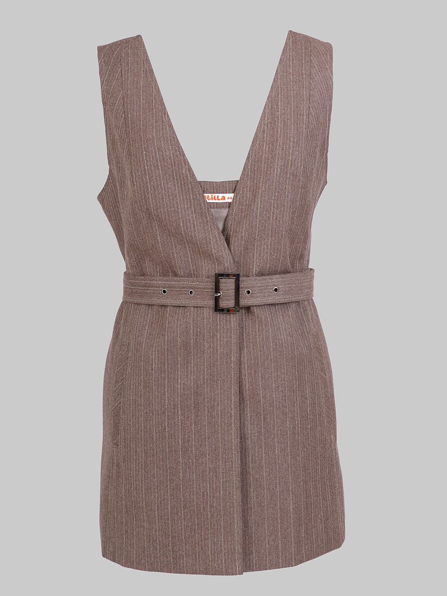 Модель с рельефными швами .Пояс с металлической пряжкой. Жилет декорирован отделочными строчками и текстовой вышивкой на лямке.