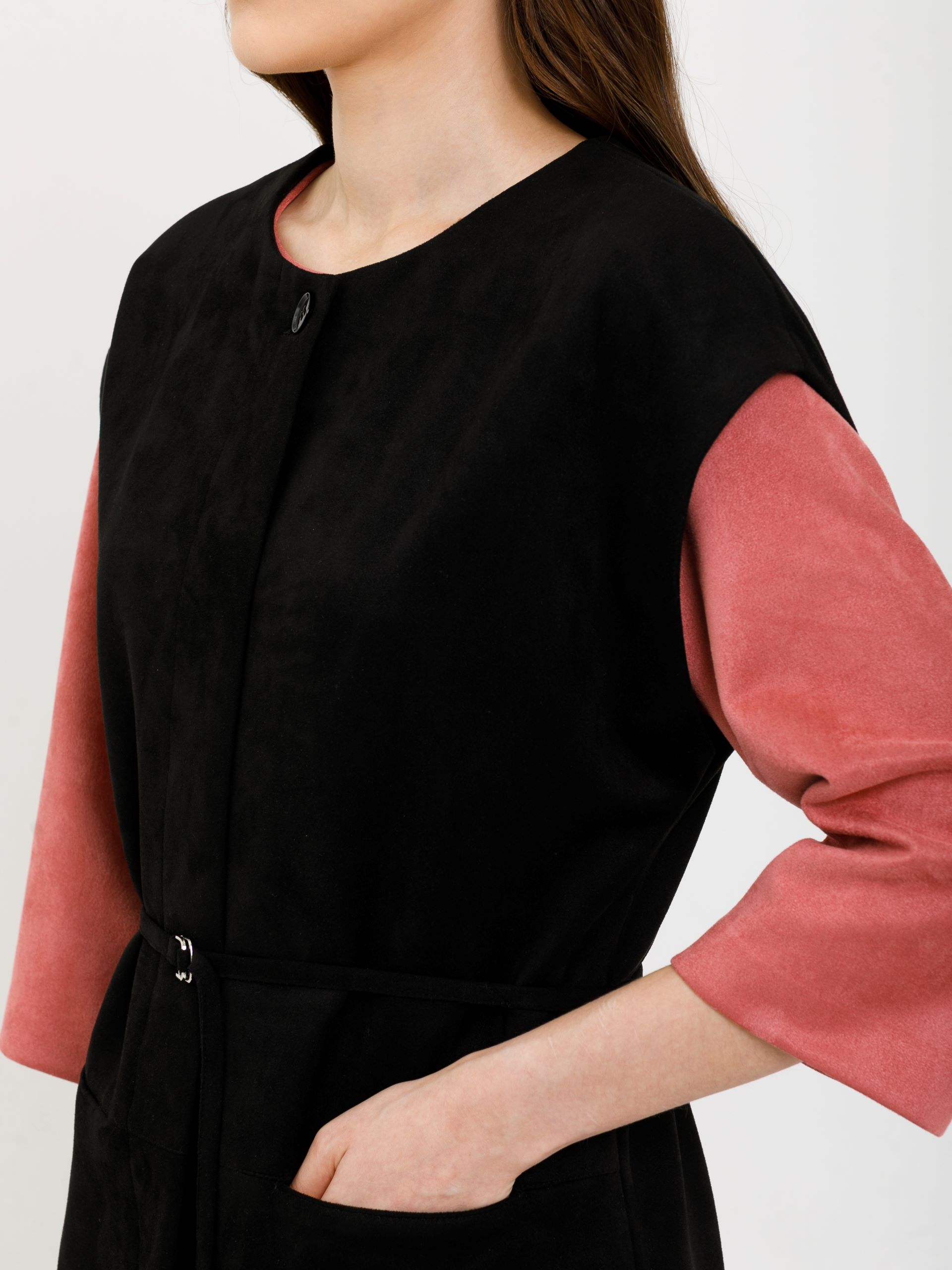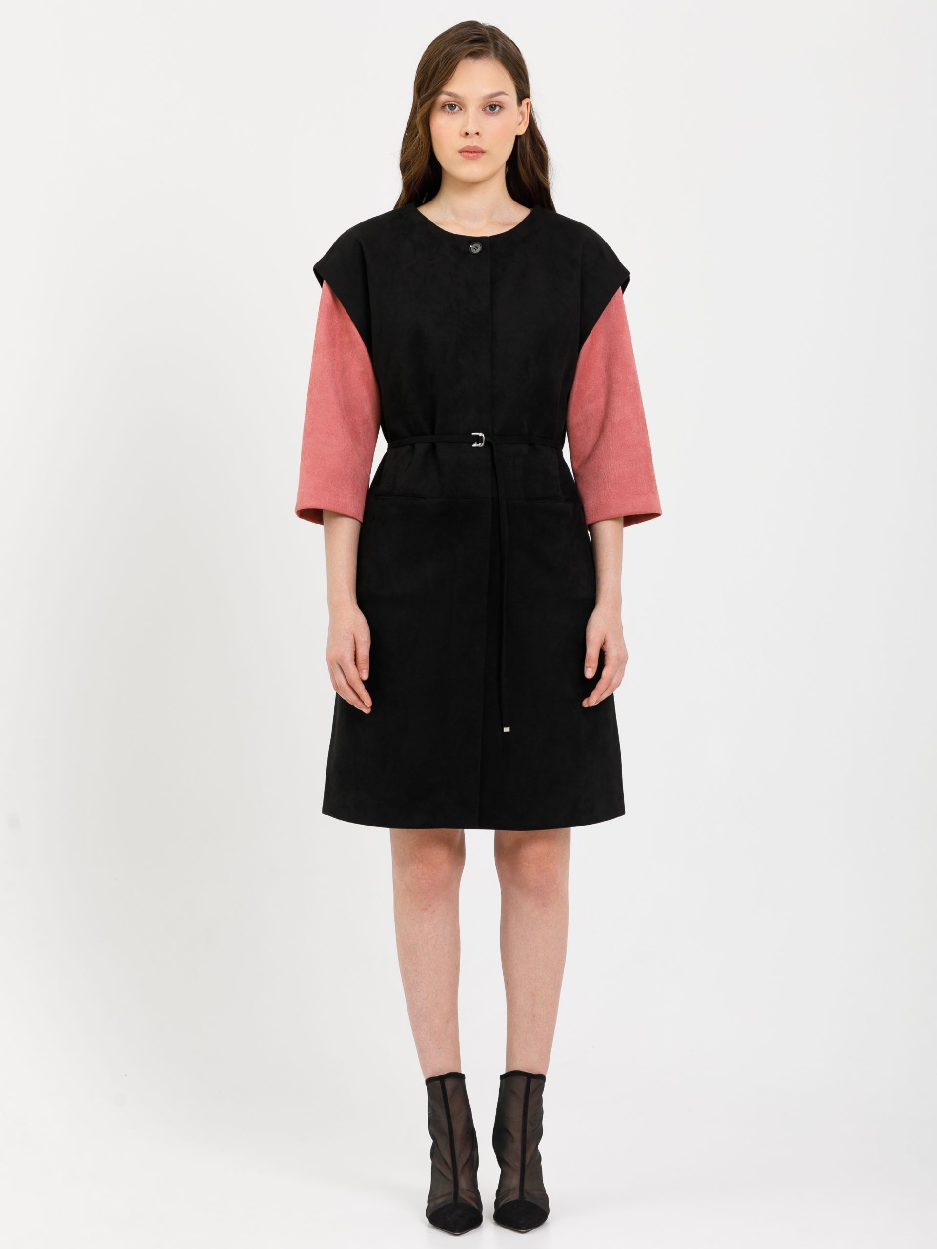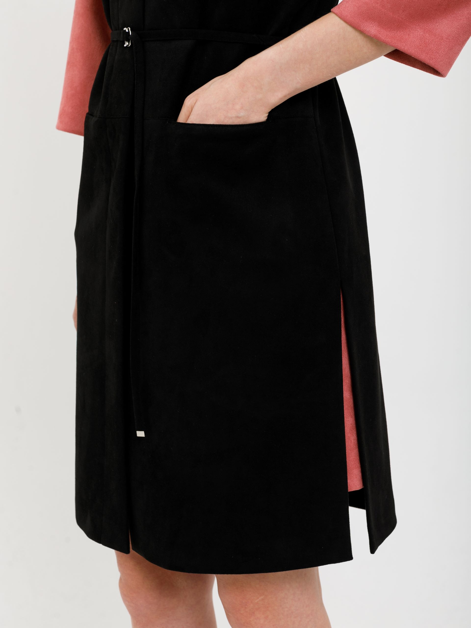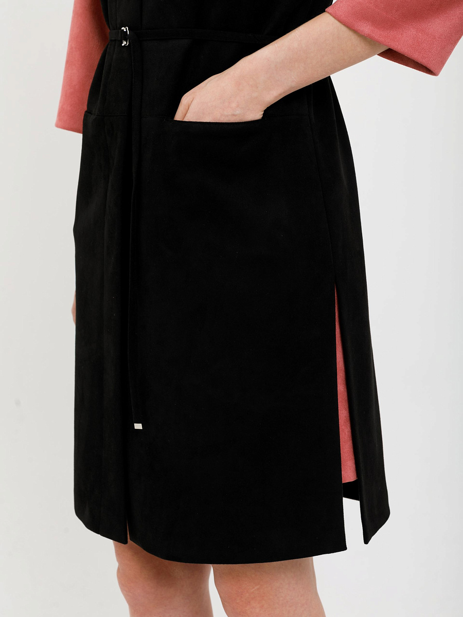 Модель прямого силуэта, со спущенным плечом, без подклада. Застёжка центральная потайная на петли и пуговицы. Спереди в горизонтальных подрезах обработаны карманы. Спинка с кокеткой и средним швом. В боковых швах разрезы. Талия подчёркнута узким поясом с пряжкой.