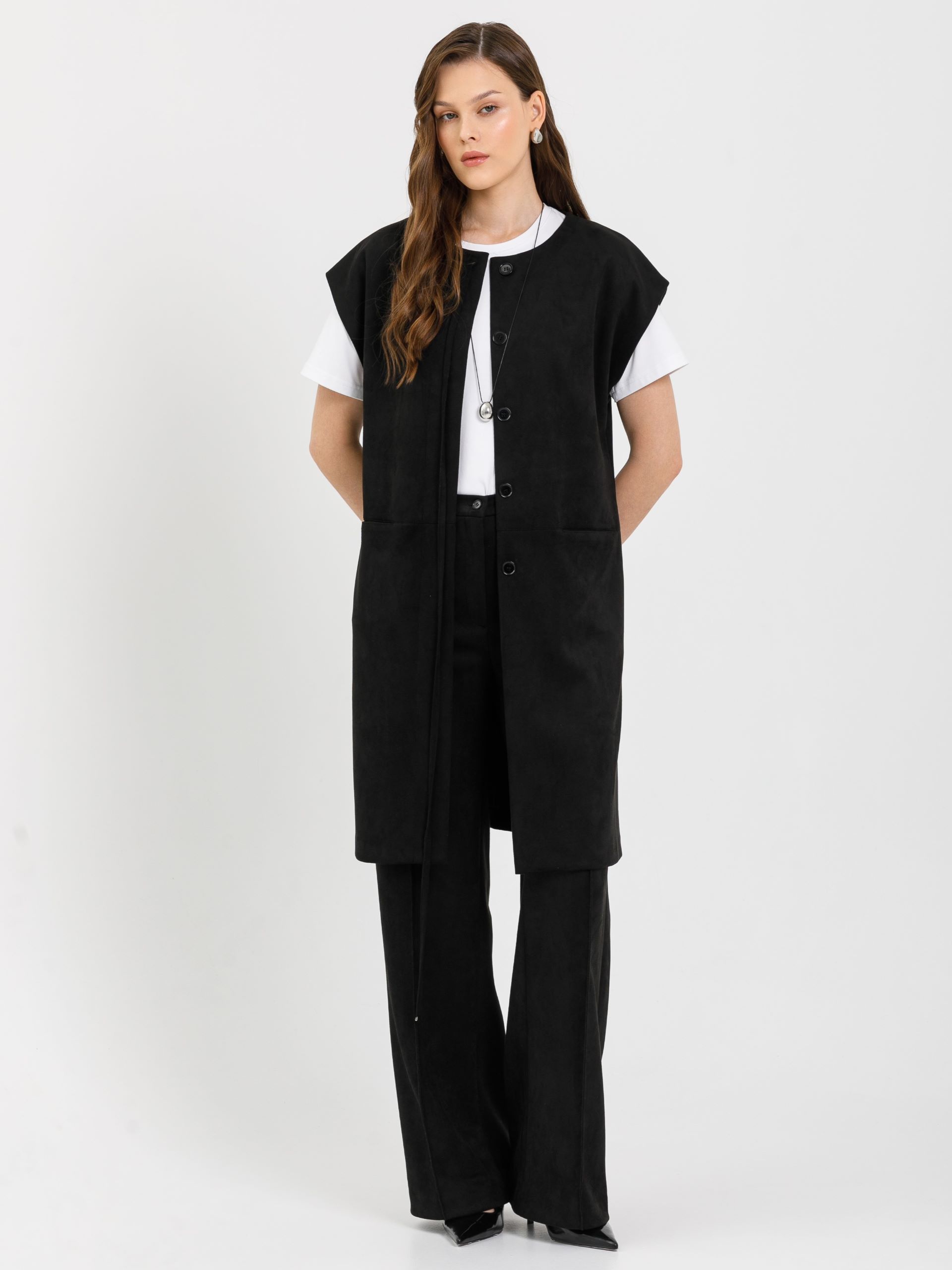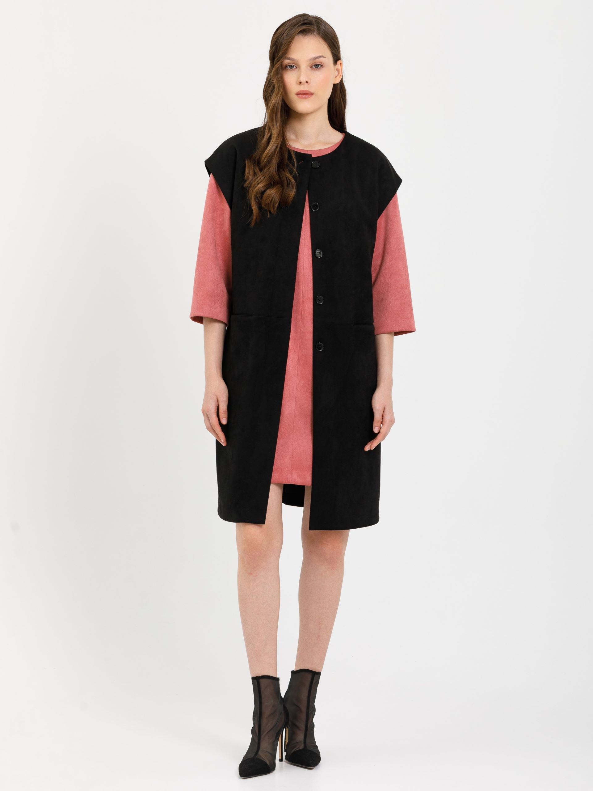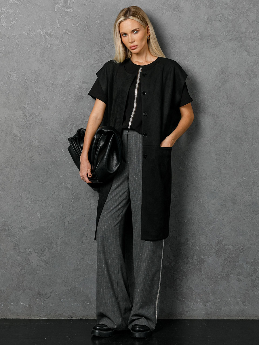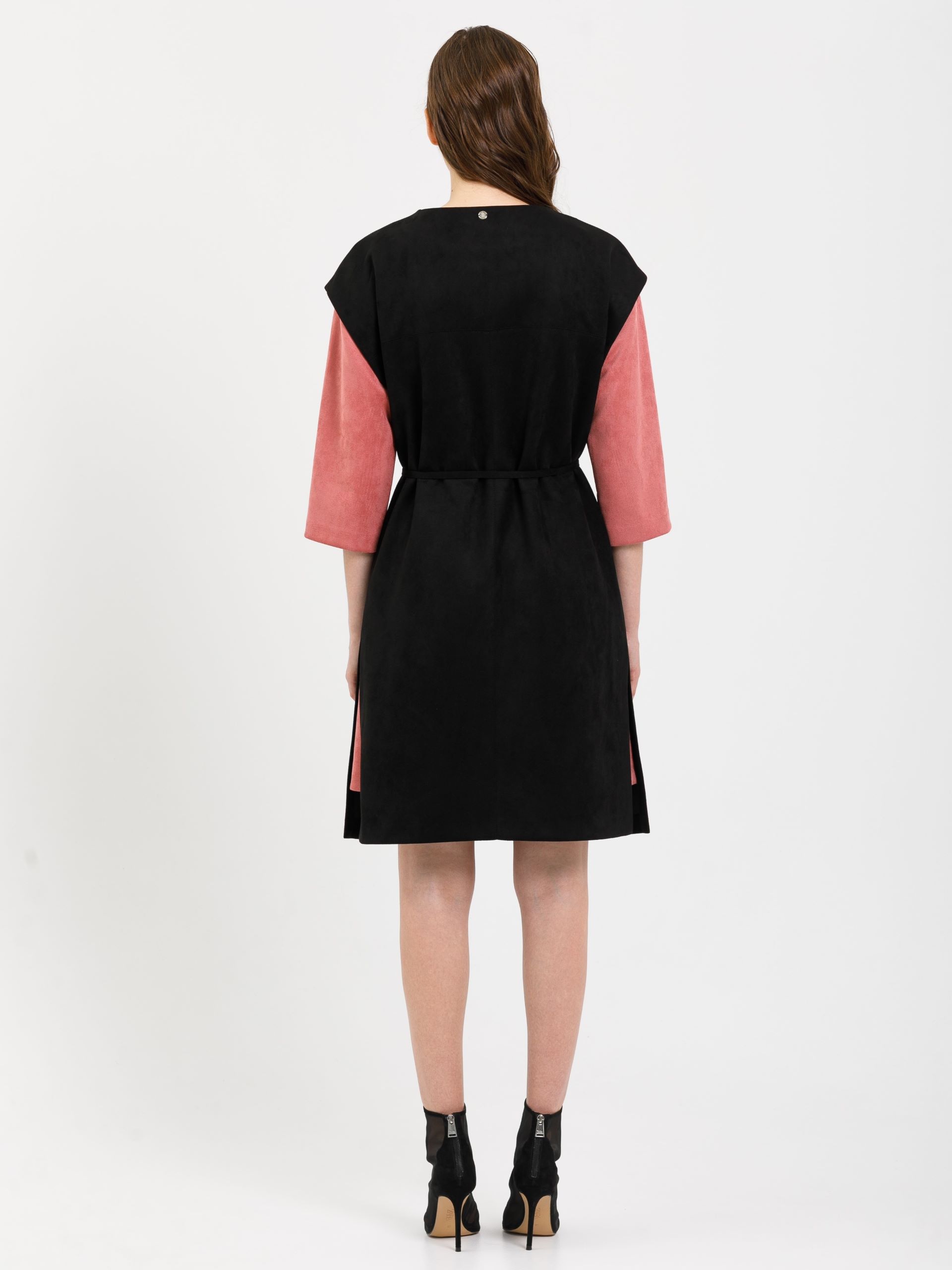Модель прямого силуэта, со спущенным плечом, без подклада. Застёжка центральная потайная на петли и пуговицы. Спереди в горизонтальных подрезах обработаны карманы. Спинка с кокеткой и средним швом. В боковых швах разрезы. Талия подчёркнута узким поясом с пряжкой.