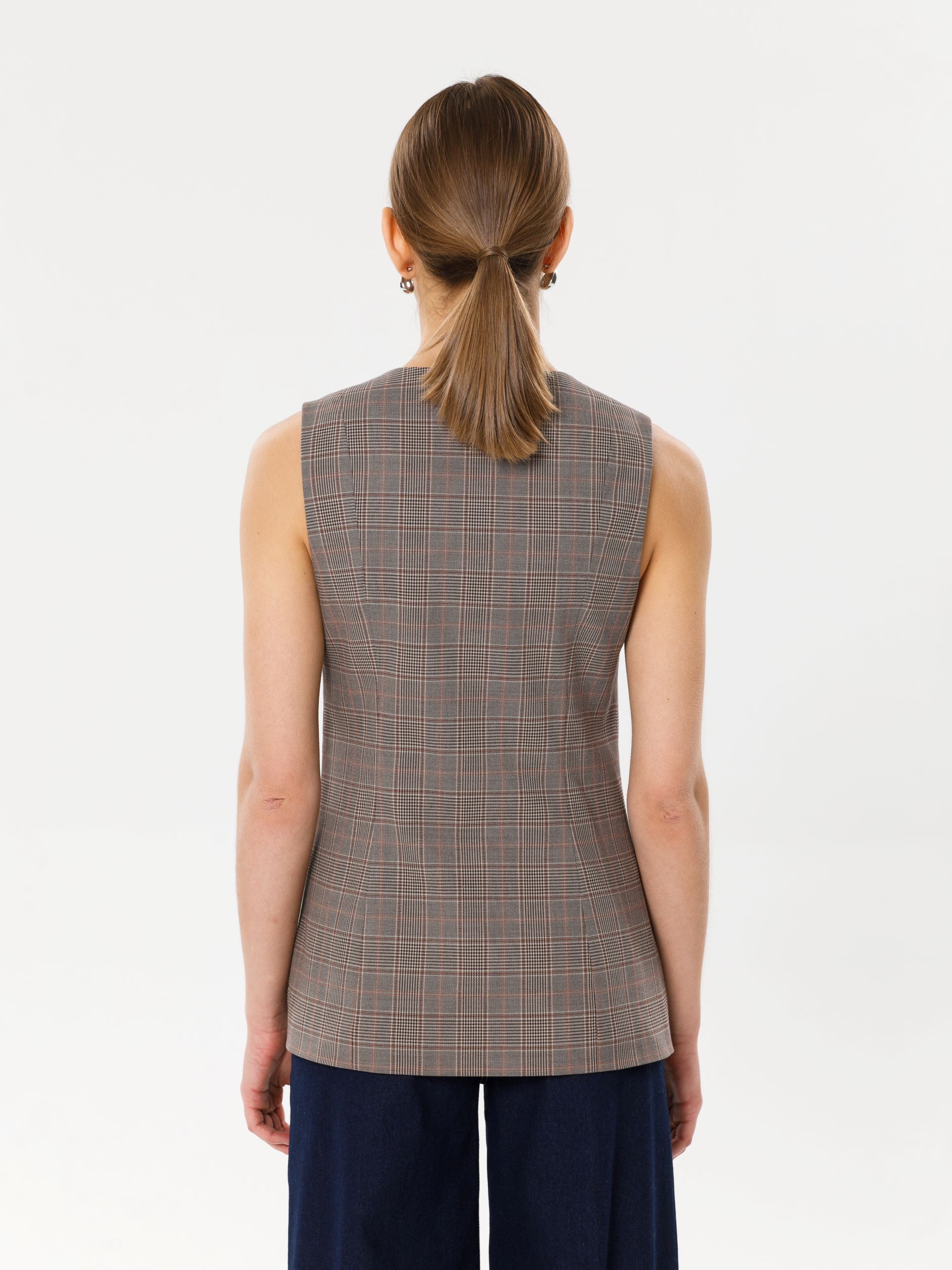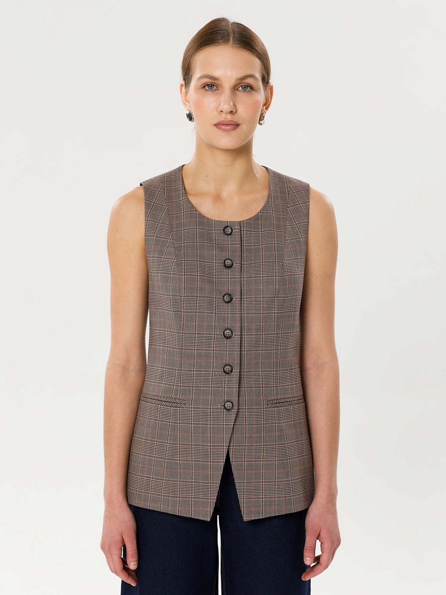 Модель полуприлегающего силуэта, с рельефами, на подкладе. Спереди прорезные карманы в рамку. Застёжка однобортная на петли и пуговицы. Вырез горловины округлый. Край борта фигурный.