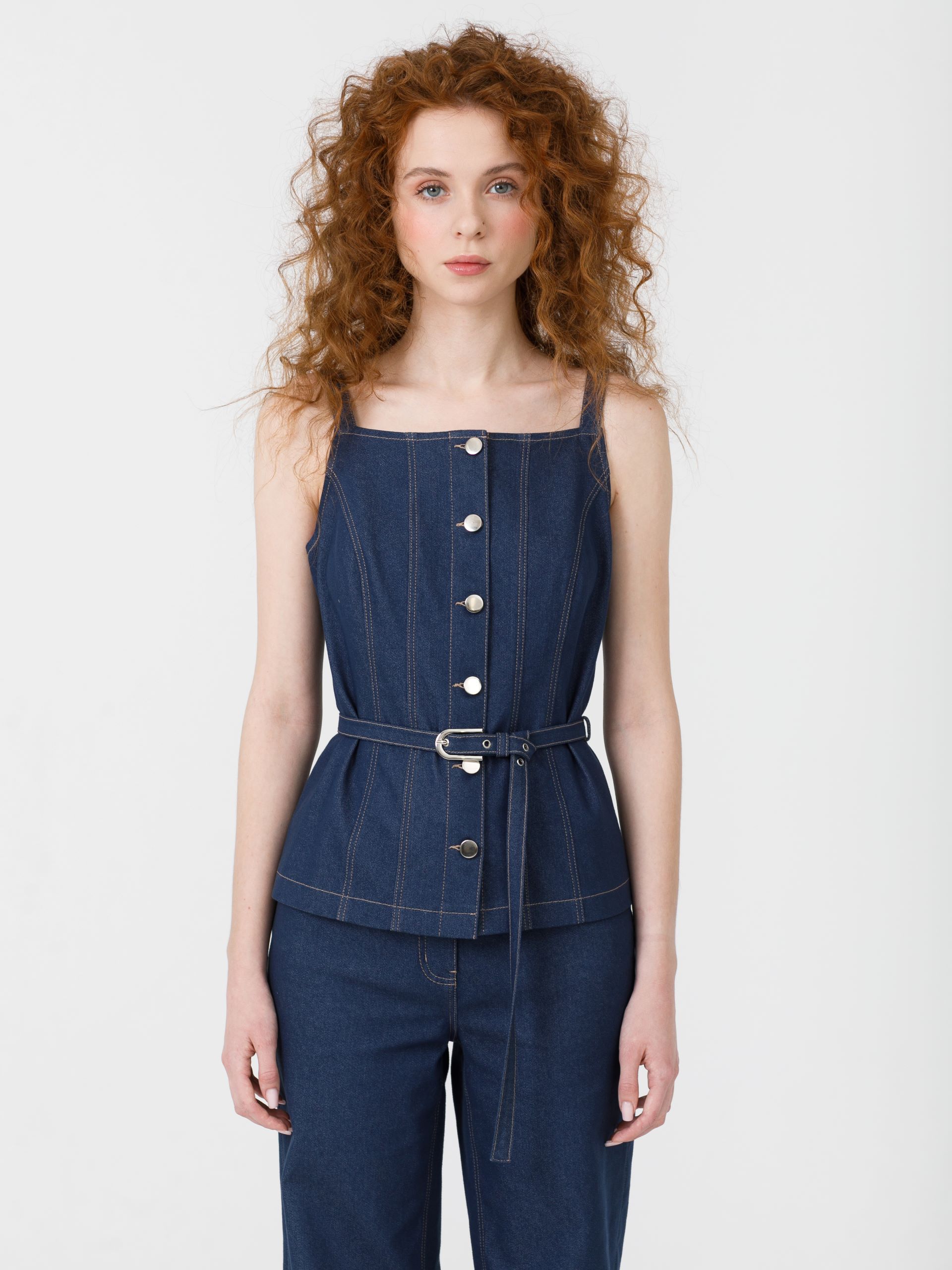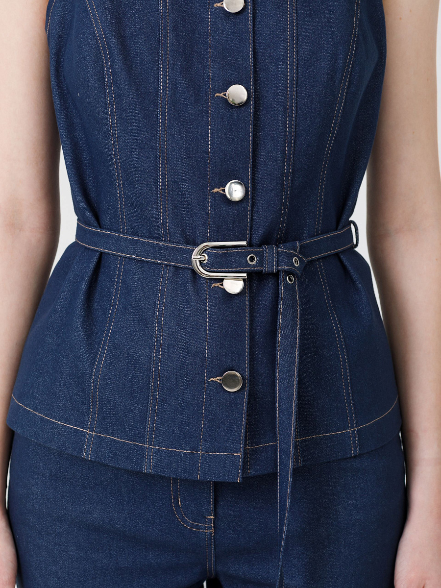 Модель полуприлегающего силуэта, на бретелях, с рельефами, без подклада. Спереди центральная застёжка на петли и пуговицы. Талия подчёркнута съёмным поясом из основной ткани с пряжкой. Жилет декорирован отделочными строчками.